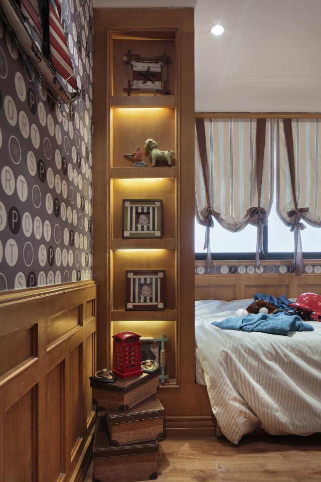 窗帘的款式个性十足,和整个房间的调调都很搭,非常吸晴。