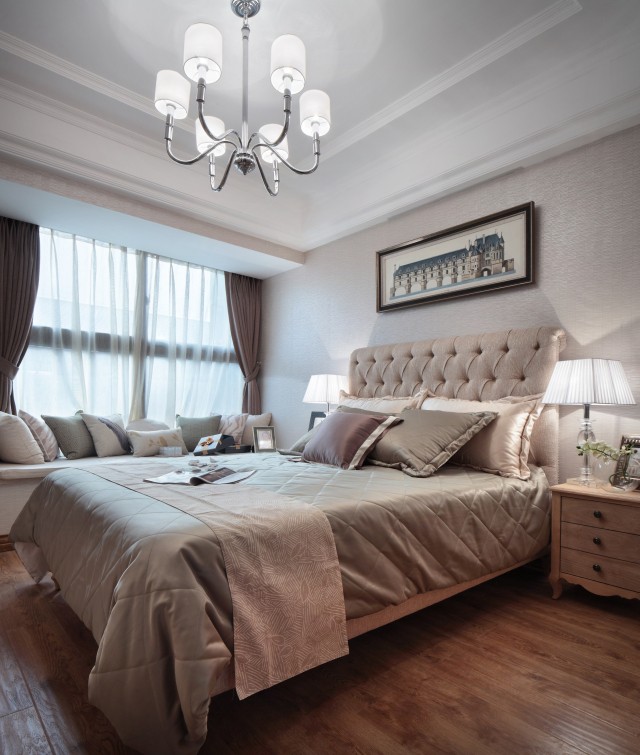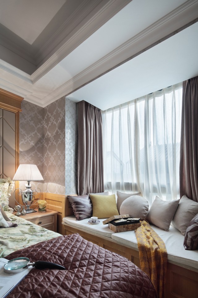 卧室里设置了几种灯光,可满足业主不同时间段,不同氛围下的使用。飘窗采光率极好,闲时可坐在那儿欣赏下窗外的风景,或者听听音乐看看书都是很不错的享受呢。