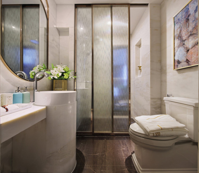 卫生间明亮的浴镜和白色的浴袍给人干净简洁的感受,整体实用且美观,墙上的壁画,亮丽的色彩让空间显得更有温度。