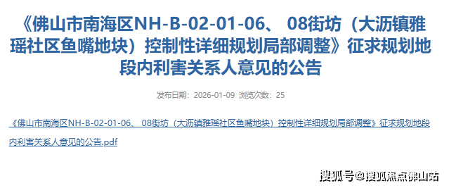 近日,佛山市南海区大沥镇人民政府发布《佛山市南海区NH-B-02-01-06、 08街坊(大沥镇雅瑶社区鱼嘴地块)控制性详细规划局部调整》征求规划地段内利害关系人意见的公告。
