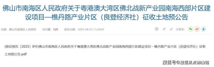 4月初,南海区人民政府发布“关于粤港澳大湾区佛北战新产业园南海西部片区建设项目—樵丹路产业片区(良登经济社)征收土地预公告”。