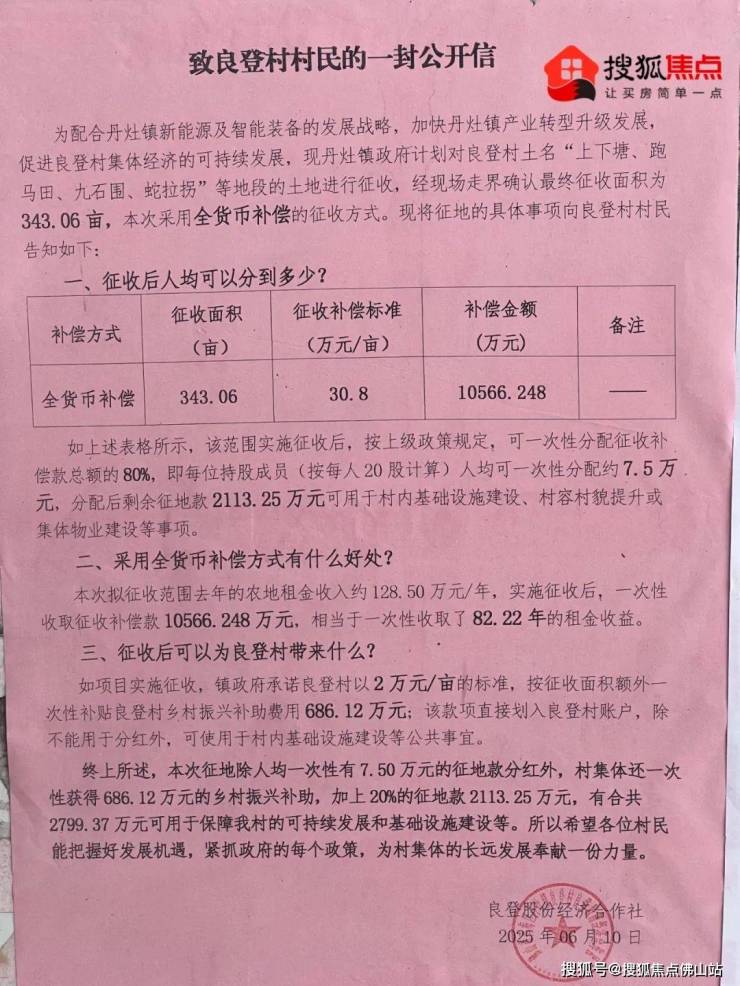 公开信显示,为配合丹灶镇新能源及智能装备的发展战略,加快丹灶镇产业转型升级发展,促进良登村集体经济的可持续发展,现丹灶镇政府计划对良登村土名“上下塘、跑马田、九石围、蛇拉拐”等地段的土地进行征收,经现场走界确认最终征收面积为343.06亩,大约22.87万㎡。