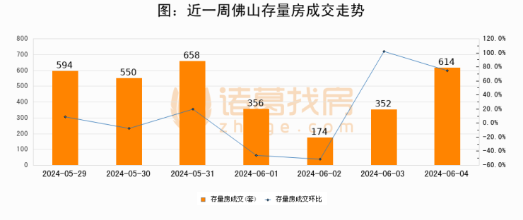 从存量房来看,2024年06月04日佛山存量房单日成交614套,比昨日增加262套,环比上涨74.4%。从近一周存量房成交来看,佛山存量房日均成交套数为471套,06月04日单日成交614套,高于近一周平均水平30.4%。