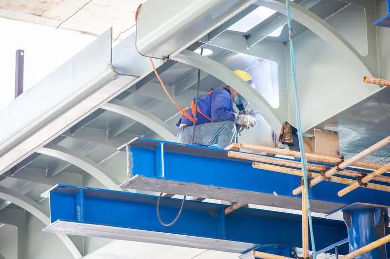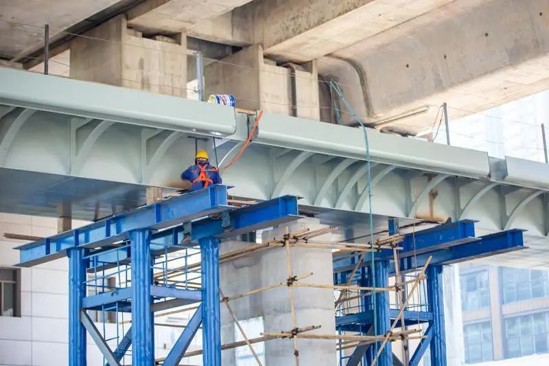 记者在现场看到,两座天桥相隔近百米,西侧天桥已完成桥梁吊装施工,天桥主体初现;东侧天桥正进行桥钢箱梁制作加工。现场,不少工人绑着安全绳在高空施工作业,桥下的桃园西路通车如常。