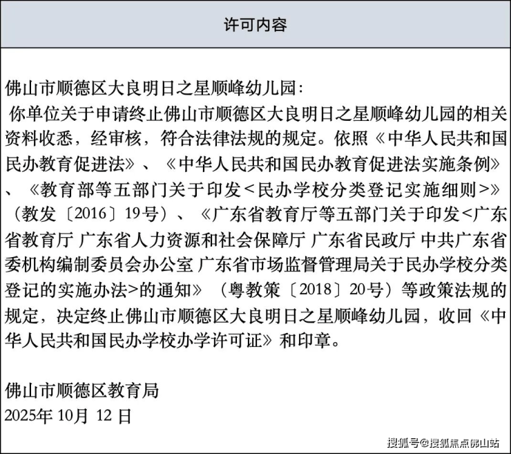 通知显示,关于申请终止佛山市顺德区大良明日之星顺峰幼儿园的相关资料收悉,经审核,符合法律法规的规定。依照《中华人民共和国民办教育促进法》、《中华人民共和国民办教育促进法实施条例》《教育部等五部门关于印发<民办学校分类登记实施细则>教发(2016]19号)、《广东省教育厅等五部门关于印发<广东省教育厅广东省人力资源和社会保障厅广东省民政厅中共广东省委机构编制委员会办公室广东省市场监督管理局关于民办学校分类登记的实施办法>的通知》(粤教策(2018]20号)等政策法规的规定,决定终止佛山市顺德区大良明日之星顺峰幼儿园,收回《中华人民共和国民办学校办学许可证》和印章。