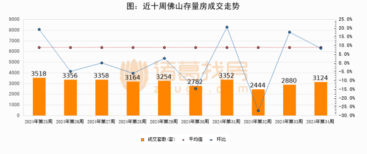 存量房方面,第34周佛山存量房成交3124套,较上周增加244套,环比上涨8.5%。从近十周成交走势来看,周均成交套数为3123套,本周高于平均水平0%。