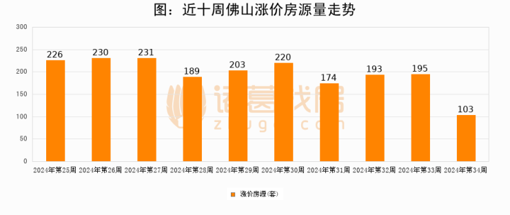 从调价房源来看,第34周佛山涨价房源103套,较上周下降47.2%。与此同时,34周涨价房源占比回落0.02个百分点,业主信心小幅波动,购房者可则需入市。