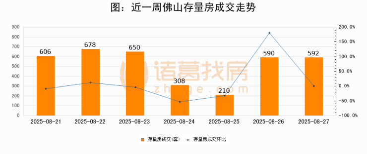 从存量房来看,2025年08月27日佛山存量房单日成交592套,比昨日增加2套,环比上涨0.3%。从近一周存量房成交来看,佛山存量房日均成交套数为519套,08月27日单日成交592套,高于近一周平均水平14.1%。