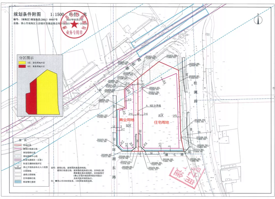 B区占地6570.71㎡,容积率≥2.5,且≤4.5;建筑密度:裙楼≤40%,且塔楼≤30%;绿地率:≥35%;建筑限高80 米;用途为纯商业用地