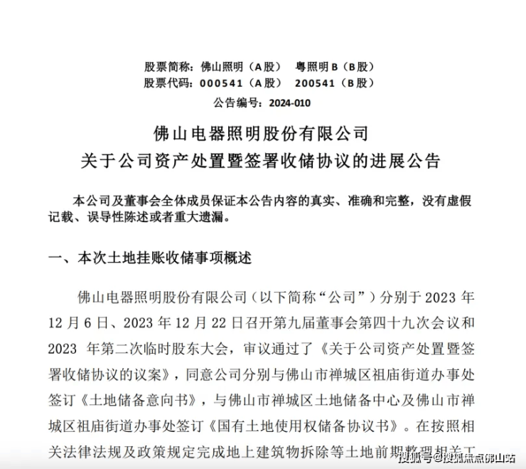 在今年2月2日,佛山电器照明股份有限公司曾发布关于公司资产处置暨签署收储协议的进展公告。