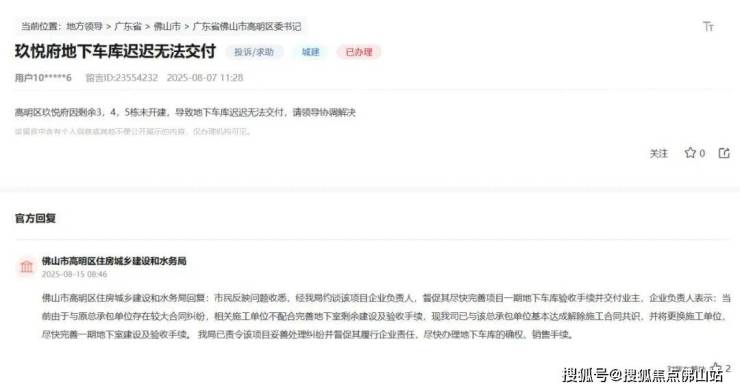 佛山市高明区住房城乡建设和水务局回复,经了解,当前由于与原总承包单位存在较大合同纠纷,相关施工单位不配合完善地下室剩余建设及验收手续,开发商已与该总承包单位基本达成解除施工合同共识,并将更换施工单位,尽快完善一期地下室建设及验收手续。