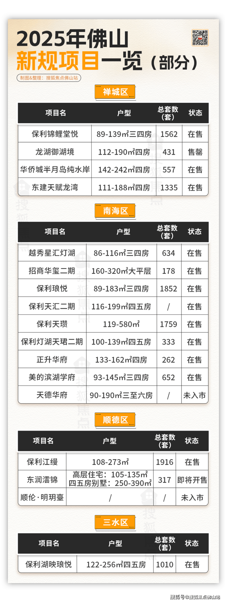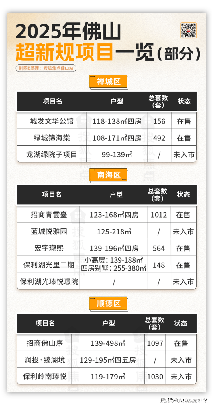 小狐梳理发现,佛山在售、售罄及筹备中的新规盘至少有17个,涵盖禅城、南海、顺德、三水。
