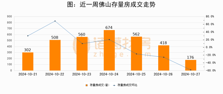 从存量房来看,2024年10月27日佛山存量房单日成交176套,比昨日减少242套,环比下降57.9%。从近一周存量房成交来看,佛山存量房日均成交套数为457套,10月27日单日成交176套,低于近一周平均水平61.5%。