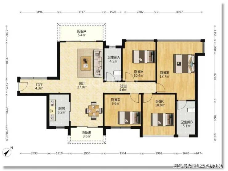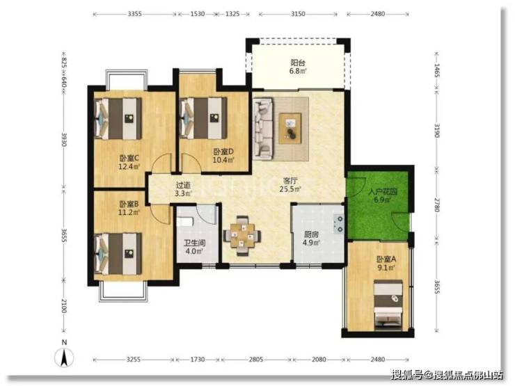 像恒福家园这套104.4㎡四房户型,套内面积有94.5,使用率9成,入门带6.9平入户花园 ,四个房间面积都很大,而且没有飘窗,实感像现在120平的户型。