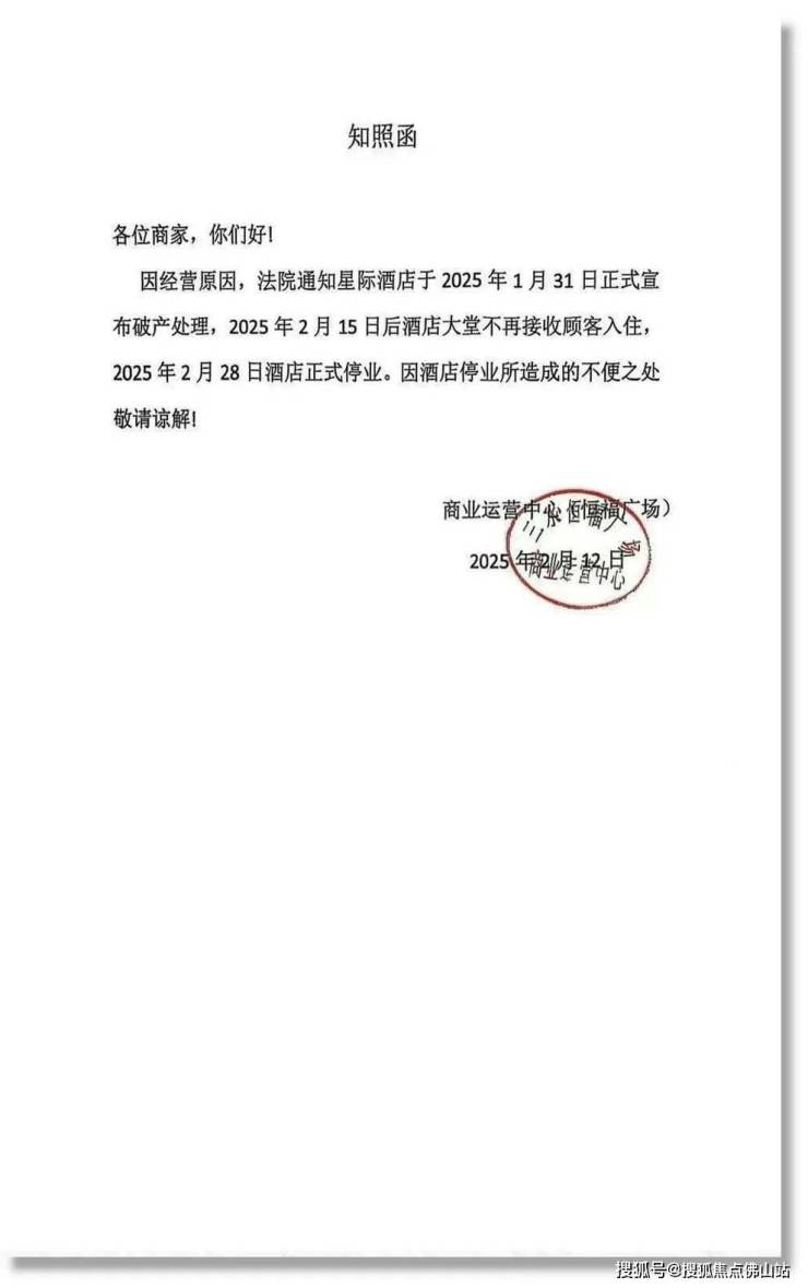 “因经营原因,法院通知星际酒店于2025年1月31日正式宣布破产处理,2025年2月15日后酒店大堂不再接收顾客入住,2025年2月28日 酒店正式停业 。”