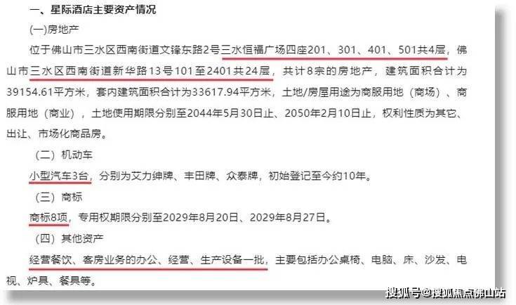 咋一看,旗下资产还不少,涵盖恒福广场四座201、301、401、501共4层 ,三水区西南街道新华路13号101至2401共24层 (即恒福星际酒店);小型汽车3台,商标8项,其他资产有办公桌椅、电脑、床、沙发、电视、炉具、餐具等。