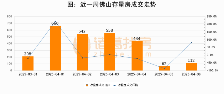 从存量房来看,2025年04月06日佛山存量房单日成交112套,比昨日增加50套,环比上涨80.7%。从近一周存量房成交来看,佛山存量房日均成交套数为368套,04月06日单日成交112套,低于近一周平均水平69.6%。