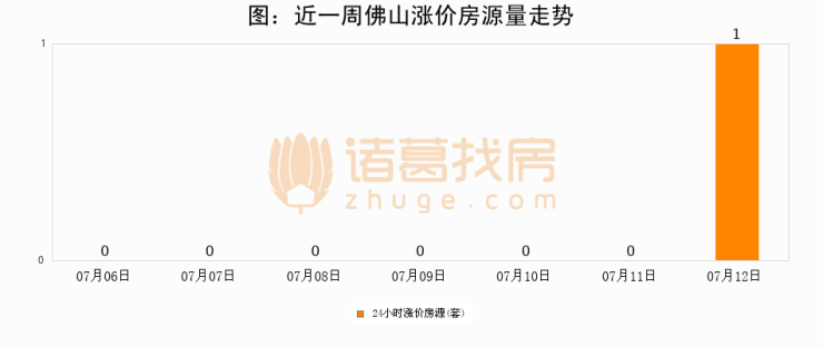 根据诸葛找房数据显示,佛山24小时涨价房源量为1套,较07月11日增加1套,环比上涨0%。与此同时,涨价房源占比小幅扩大,业主信心有所提升。
