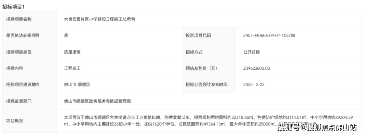 11月19日,大良云鹭片区小学建设工程施工总承包的招标计划正式发布,预计于12月22日发布正式招标文件。公示显示,该项目位于佛山市顺德区大良街道永丰工业南路以南,驹荣北路以东,项目规划用地面积约32318.6…
