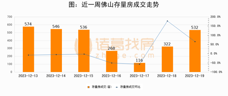 从存量房来看,2023年12月19日佛山存量房单日成交532套,比昨日增加210套,环比上涨65.2%。从近一周存量房成交来看,佛山存量房日均成交套数为413套,12月19日单日成交532套,高于近一周平均水平28.8%。