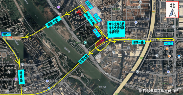 一期施工时,季华北路至季华大桥底上桥辅道封闭,去往绿岛湖的车辆,可在季华北路掉头车道掉头,绕行至同济路大桥后经禅港路汇入季华西路;也可绕行至季华一路华宝路隧道处,掉头后汇入季华大桥往西通行。