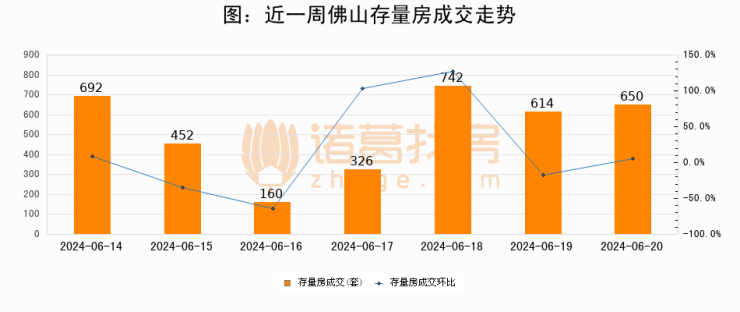 从存量房来看,2024年06月20日佛山存量房单日成交650套,比昨日增加36套,环比上涨5.9%。从近一周存量房成交来看,佛山存量房日均成交套数为519套,06月20日单日成交650套,高于近一周平均水平25.2%。