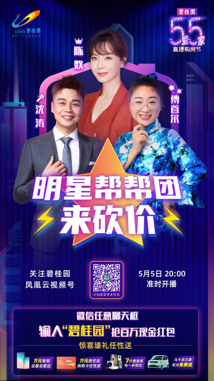今年的“55购房节”最重磅的是,5月5日20:00,“碧桂园凤凰云”官方微信视频号将开启直播购房活动,知名演员陈数、综艺大咖傅首尔、知名主持人沈涛和地产大V刘德科一起组成明星帮帮团,将与碧桂园6位区域总裁和营销负责人组成的“总裁天团” 深度探讨购房问题。