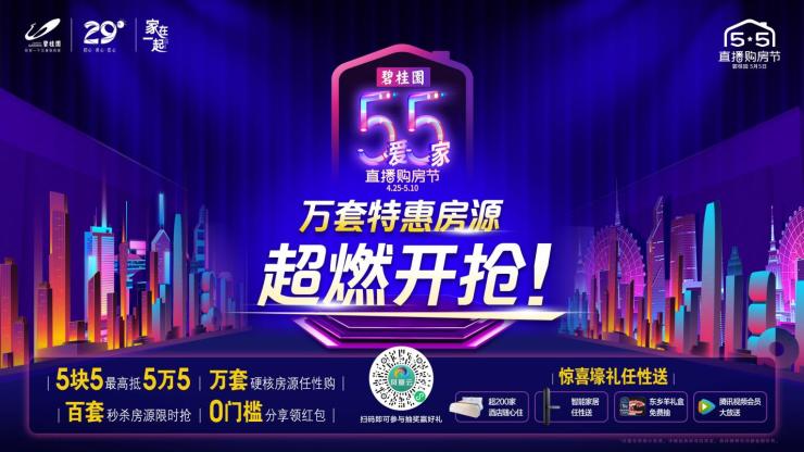 4月25日-5月10日,碧桂园将以直营购房平台——凤凰云小程序为主阵地,同时联动碧桂园安居客品牌馆、碧桂园天猫官方旗舰店同步上线“5爱5家 为爱安家”活动。5月5日当晚,碧桂园还将开启线上直播,为下单客户以及广大粉丝,准备了加码的秒杀房源、百万红包雨、锦鲤大礼包等多重福利。