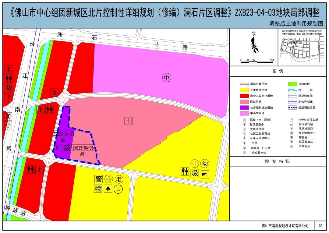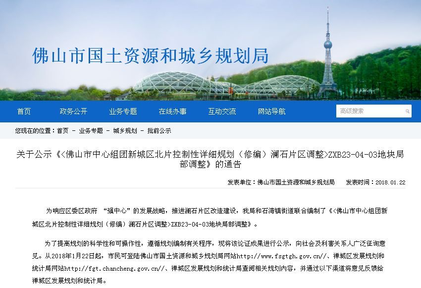 近日,市国土资源和城乡规划局发布《<佛山市中心组团新城区北片控制性详细规划(修编)澜石片区调整>ZXB23-04-03地块局部调整》的通告公示文件。