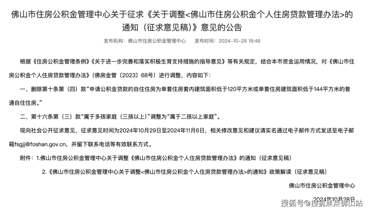 10月28日,佛山市住房公积金管理中心发布了关于征求《关于调整<佛山市住房公积金个人住房贷款管理办法>的通知(征求意见稿)》意见的公告。