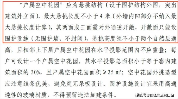 在立体园林住宅方案中提到,“户属空中花园”为悬挑结构,最大悬挑长度不小于 4 米,其两面或三面需对外通透开敞,开敞面只能设围护设施。