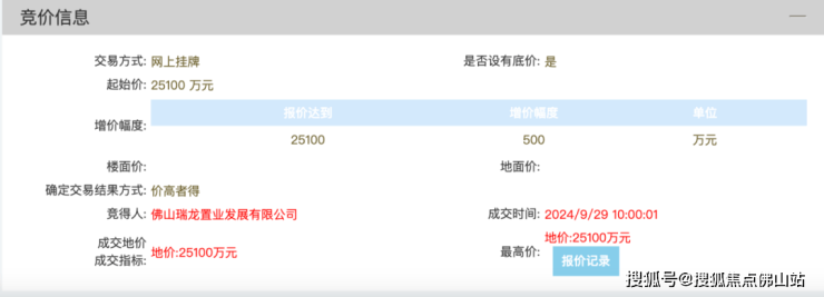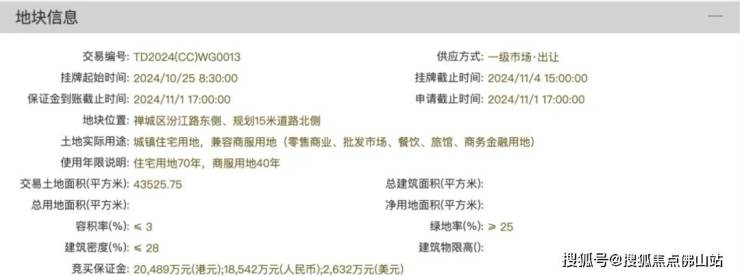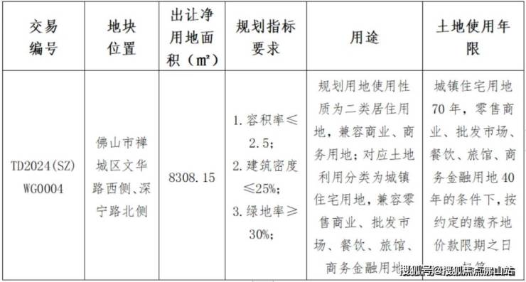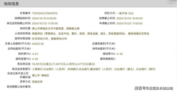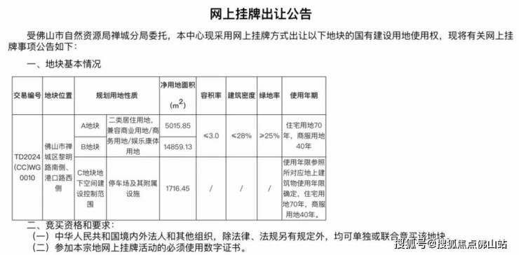 9月25日,佛山市公共资源交易中心正式挂牌 仁和仁伍地块 ,起拍价 8.7亿 ,折合楼面价 4242元/㎡ ,于10月24日15时网拍。