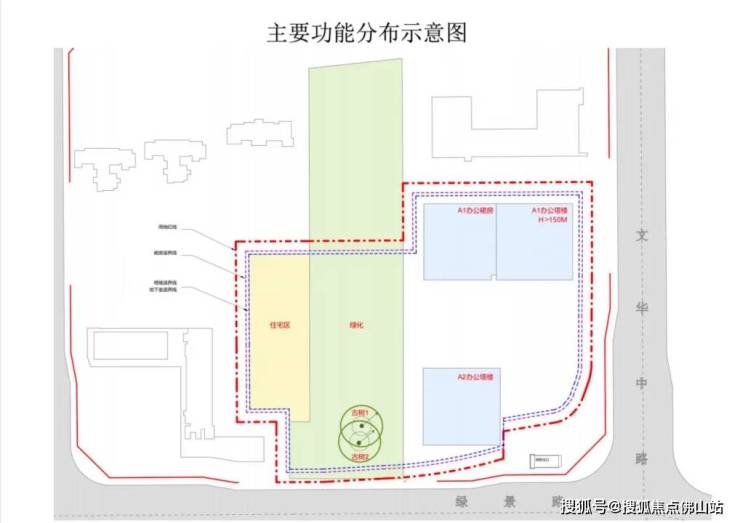 文件中还给出了宗地主要功能分布示意图,将规划2栋办公塔楼、办公裙房以及1个住宅区。