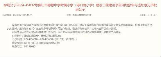 早在今年六月,禅城区自然资源局发布了《现有惠景中学申请办理佛山市惠景中学附属小学(港口路小学)建设工程建设项目用地预审与选址意见书批前公示》。