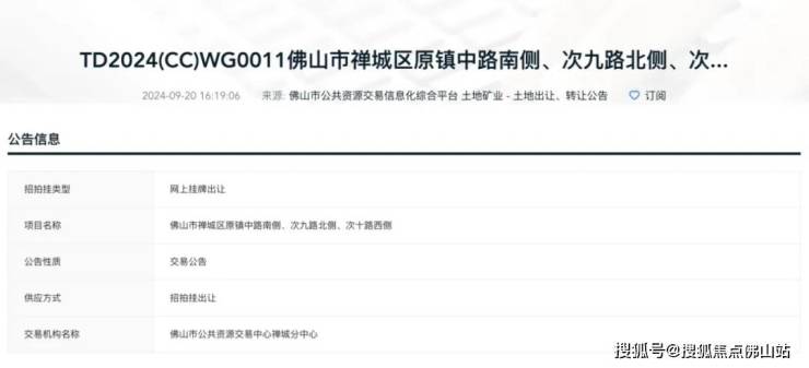 9月20日,佛山市自然资源局禅城分局发布了有关 原镇中路南侧、次九路北侧、次十路西侧地块 的出让公告。