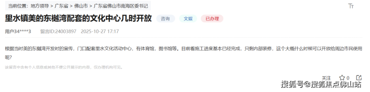近日,有网友在人民网领导留言板上咨询美的东樾湾配套文化中心的建设进度。
