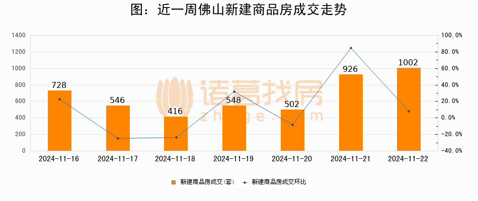 根据佛山市住房保障和房产信息网数据显示,2024年11月22日佛山新建商品房成交1002套,较昨日增加76套,环比上涨8.2%