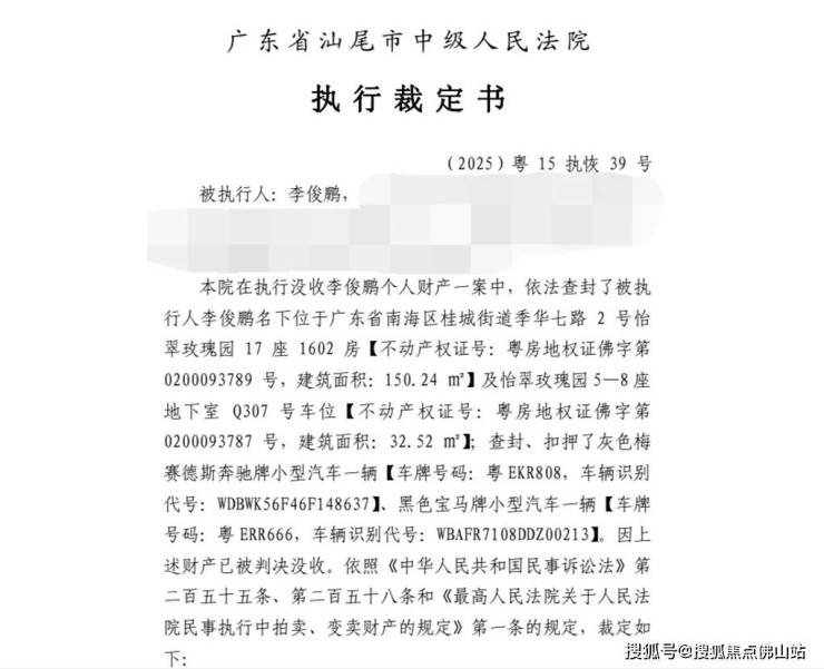 平台还附上一份“执行裁定书”,内文显示被执行人为李俊鹏,执行裁定书编号为(2025)粤15执恢39号。