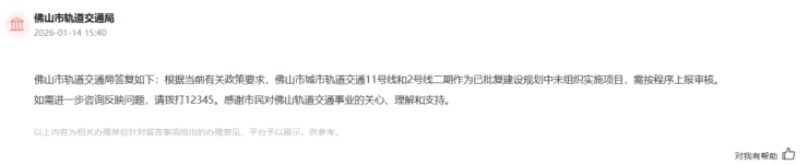 另外,针对5、6号线的建设进度,佛山市轨道交通局回应称,这两条线路为远期规划,并未纳入佛山市已获批的建设规划,因此尚不具备建设实施条件。