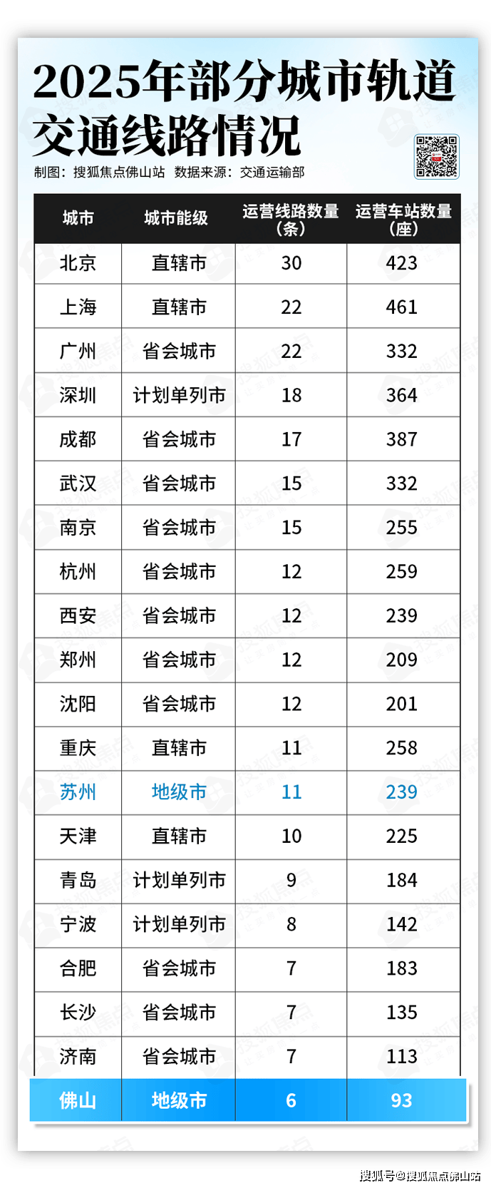 放眼全国各大城市,佛山的轨道数量位居第20名。