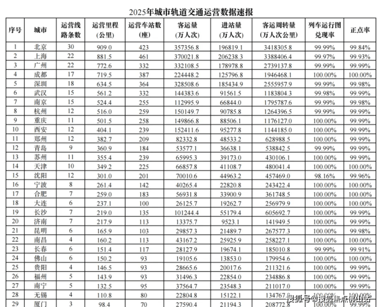 近日,交通运输部发布2025年城市轨道交通运营数据报告。