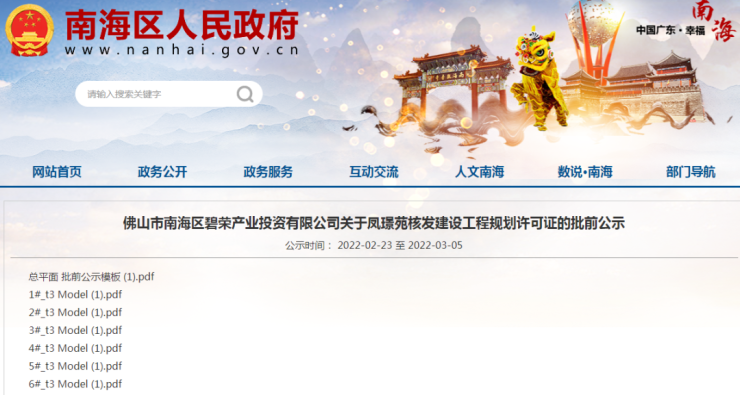 近日,从南海区人民政府获悉,南海区碧荣产业投资有限公司关于凤璟苑核发建设工程规划许可证发起批前公示。