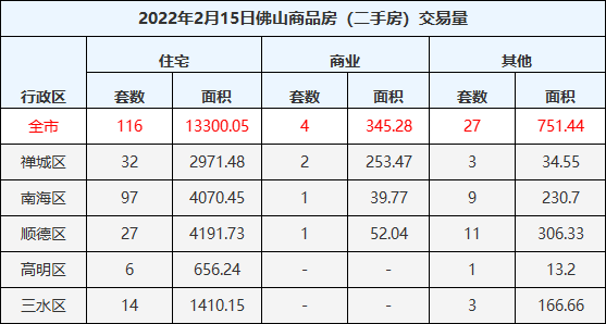 2月15日佛山五区一手房网签157套,二手房网签116套