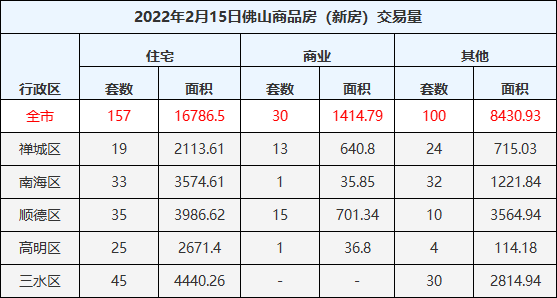 2月15日,佛山一手住宅成交157套,成交面积16786.5㎡