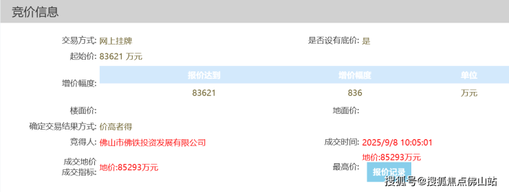 今日(9月8日),佛铁投资以85293万竞得佛山西站旁一宗商住地,折合成交楼面价为4193元/㎡。