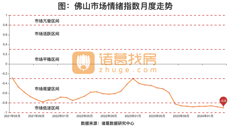 根据诸葛找房数据研究中心监测数据显示,2024年04月,佛山市场情绪指数为-0.9,较上月下降0.02,位于市场低迷区间。