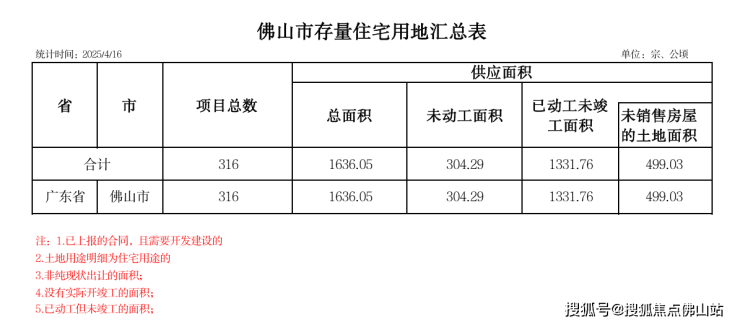 公告显示,佛山市存量住宅用地共有316宗,供应面积为1636.05万㎡。