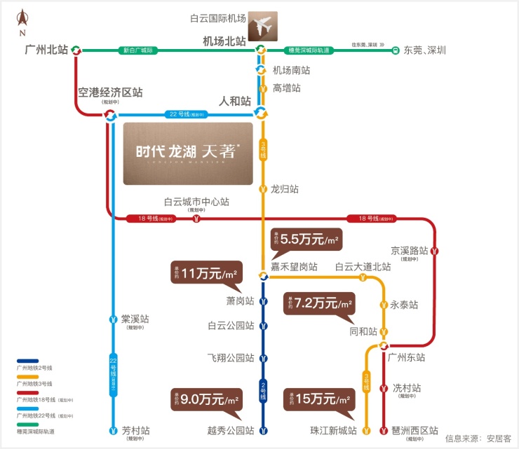 资料显示,时代龙湖天著,周边坐拥空港经济区内3大地铁线路交汇,从项目出发,通过3号线(人和站直线2KM)往北2站便是白云机场,向南直通珠江新城!未来空港经济区内还将迎来18号线、22号线(规划中)。与此同时,广佛环线城轨(在建)、穗莞深城轨(部分开通)以及新白广城际(部分开通)都将连通项目周边,未来或将进一步汇聚湾区各大城市澎湃动能。