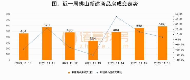 根据佛山市住房保障和房产信息网数据显示,2023年11月16日佛山新建商品房成交586套,较昨日增加28套,环比上涨5%