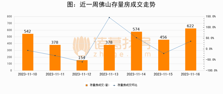 从存量房来看,2023年11月16日佛山存量房单日成交622套,比昨日增加166套,环比上涨36.4%。从近一周存量房成交来看,佛山存量房日均成交套数为443套,11月16日单日成交622套,高于近一周平均水平40.4%。